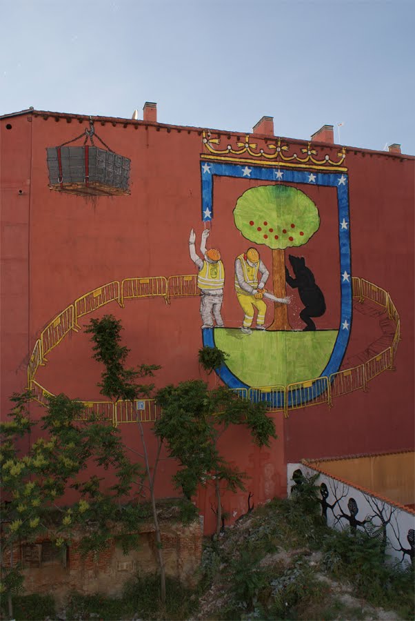 Blu nos visitó el pasado mes de mayo, coincidiendo con nuestra fiesta de inauguración y nos dejó, su particular versión del escudo de ayuntamiento de Madrid, en los muros de Ésta es una Plaza.