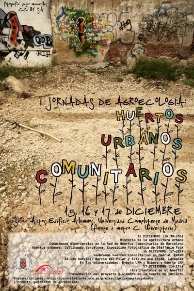 Las I Jornadas de Agroecología: Huertos urbanos comunitarios se celebrarán el 15, 16 y 17 de diciembre de 2010 en la Universidad Complutense de Madrid. Durantes 3 días recorreremos la historia de la agricultura urbana desde la revolución industrial a los huertos urbanos del siglo XXI, compartiremos diversas experiencias de huertos comunitarios en Barcelona y en Madrid, en barrios y en universidades, desde las más veteranas a las recién iniciadas, como la de nuestro huerto donde daremos fin a las Jornadas sembrando la huerta de invierno. Con estas jornadas iniciamos la andadura del Aula Rural y el Huerto Agroecológico Comunitario, un nuevo proyecto de intervención teórica y práctica-militante impulsado por estudiantes, PAS, investigador@s y profesor@s de la Universidad Complutense de Madrid que están involucrad@s en diferentes iniciativas en torno a la Agroecología y la Soberanía Alimentaria en Madrid. El objetivo es doble: crear un espacio de reflexión, formación e investigación sobre agroecología, soberanía alimentaria y las transformaciones en el mundo rural (AULA RURAL), y generar un espacio de acción y socialización (HUERTO AGROECOLÓGICO COMUNITARIO), para aprender a producir alimentos sanos, ganar terreno a la ciudad y contribuir a la recuperación y mantenimiento de la biodiversidad, cultivando y reproduciendo variedades locales.